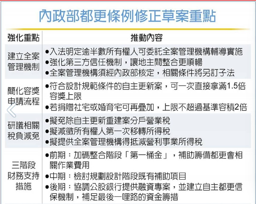 內政部《都更條例》部分條文修正草案出爐,預計5月報政院核定、拚6月送立院審查。據了解,本次將修正11條,重點包括一、建立自主都更「全案管理機構」委任機制,將委託第三方專業信任機制實質入法;二、調整容積獎勵機制,簡化申請容積獎勵的流程,符合條件的自主都更案可直接取得上限1.5倍容獎;三、研議相關稅負減免,將與財政部協調增訂自主都更案相關所得稅負減免。