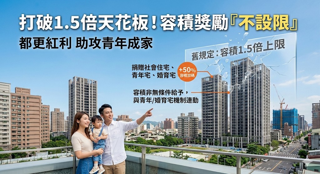 在高房價與少子化雙重壓力下,政府近期釋出都市更新新方向,行政院長卓榮泰於最新施政報告中指出,未來將加速推動以住戶為主體的都市更新,並放寬容積獎勵1.5倍的上限,翻轉過去逐項條件疊加的計算方式,若開發案願意捐贈社會住宅、青年宅或婚育宅,容積獎勵可加碼50%,讓都市更新所創造的開發利益,優先導入青年與育兒族群的居住支持,換言之,容積並非無條件給予,而是必須與青年住宅與婚育住宅供給機制相互連動。
